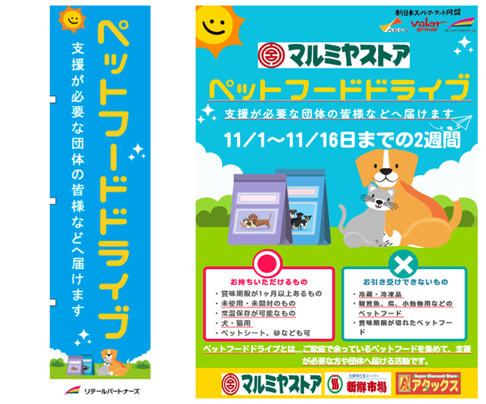11/1(土)「犬の日🐶」~11/16(日)まで以下の8店舗にて「ペットフードドライブ」を実施いたします。